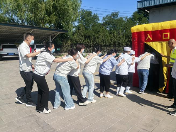 3、在模擬黑暗濃煙環境的逃生屋演練中,參訓人員10人一組,所有人員手肩相連,整齊有序分批體驗真實火場逃生,強化心理素質。